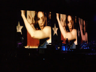 o bombardeio visual é frenético e madonna tem uma companhia de dança inteira ao seu lado, com a “ação” se desenrolando em diversas frentes, nos telões, nos palcos laterais, nos palcos que se desprendem do chão com macacos hidráulicos, nos solos dos músicos.