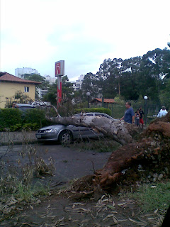 e aí tinham caído quatro eucaliptos por causa da chuvarada. um deles caiu em cima de um carro estacionado, esmagando o capô.