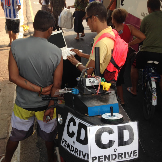 Outra cena foi o camelô fazendo na hora a seleção e a gravação ao gosto do freguês no mercado Ver-o-Peso. No meio da rua, no ponto de ônibus. Bastava o cara chegar e ele tirava o laptop da garupa da bicicleta e fazia a seleção.