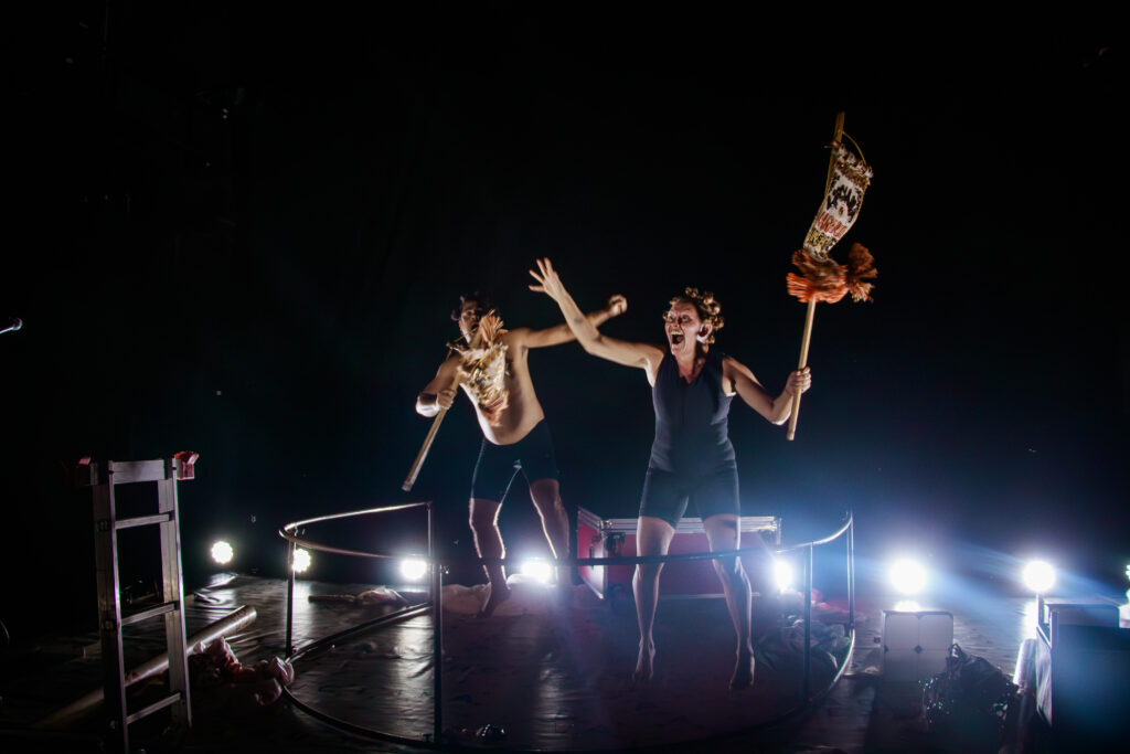 Há ainda uma camada que só se revela depois, quando Flecha sobe ao palco para explicar que a cenografia e a iluminação são feitas de materiais reciclados e descartados. Durante a encenação, isso não se sobressai. Quando a origem é revelada, o que muda não é essa leitura visual, mas a política: estamos diante de um grupo que recusa a obsolescência como prática cotidiana, silenciosa, incorporada ao trabalho.