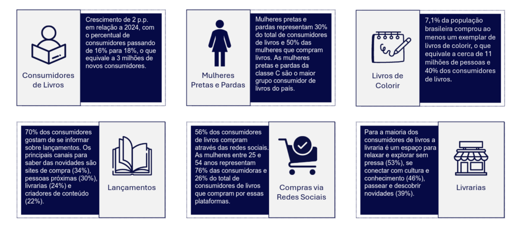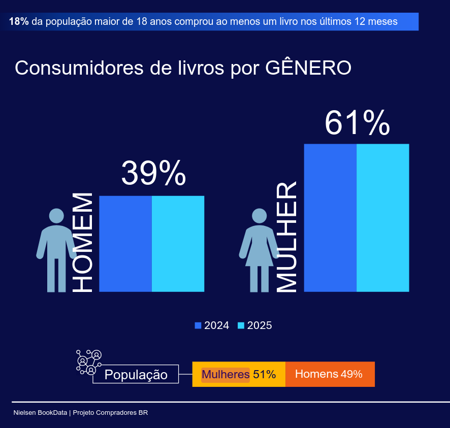 A pesquisa também traz dados sobre o consumo de obras digitais e sobre os não consumidores de livros. É um painel fundamental para quem pensa o livro e a leitura, mas também a cultura em geral no país. Entender esse funcionamento e encontrar saídas para que mais gente leia e mais livrarias sejam abertas: estes são apenas dois desafios colocados pelos números da pesquisa. Ao todo, o levantamento da Nielsen ouvir 16 mil pessoas, entre 13 e 19 de outubro de 2025. A margem de erro é de 0,8 ponto percentual e o nível de confiança, de 95%.