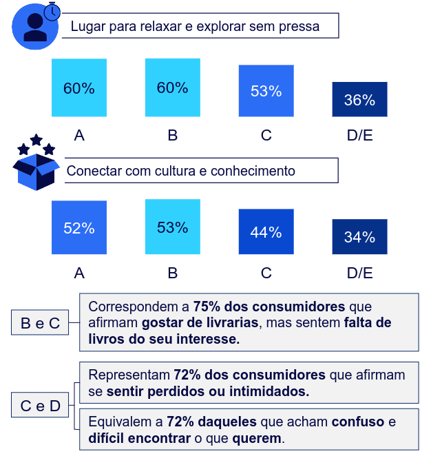 A livraria é tida como um “ótimo lugar para relaxar e explorar sem pressa” por 53%, para “se conectar com cultura e conhecimento” (46%), um bom lugar “para passear e conhecer coisas novas” (39%) e “um refúgio do barulho e da correria do dia a dia” (35%). Essas respostas mostram a livraria como um espaço de libertação do trabalho cotidiano, embora a percepção sobre isso mude conforme as classes sociais.