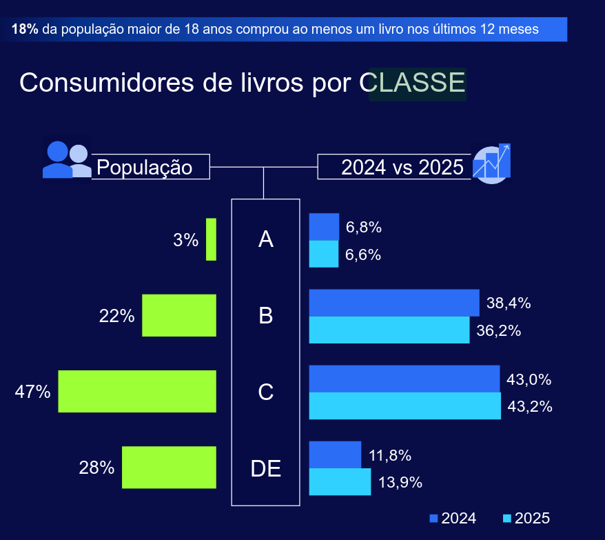 Além disso, o bom desempenho da economia nos últimos três anos parece ter ajudado a fazer crescer o contingente de compradores de livro. Em 2025, 18% dos entrevistados (todos maiores de 18 anos) eram compradores de livros, contra 16% na pesquisa de 2024. Esse crescimento de dois pontos percentuais significa que o número de consumidores cresceu em 3 milhões de pessoas.