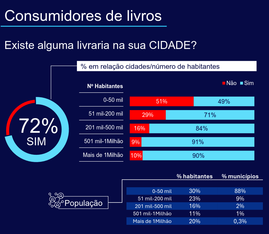 Nesse sentido, os brasileiros sentem muita falta de livrarias perto de casa: 88% dos municípios brasileiros têm até 50 mil habitantes, e é neles que os compradores de livros sentem mais falta da existência de um local para comprar livros.