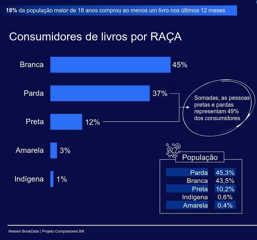 Quando comparamos o perfil dos compradores de livros com o da população em geral, percebemos algo interessante: a proporção de pretos entre os leitores é cerca de 20% maior do que a de pretos na população brasileira em geral. Entre os brancos, apesar de terem a renda significativamente maior, o percentual de leitores sobe apenas 1,5 ponto percentual, ou seja, é apenas 3,4% maior do que na população em geral. Há menos pardos entre os compradores de livros (37%) do quem entre a população em geral (45%). Os indígenas são 0,6% da população e 1% dos compradores de livros (é preciso ver quão arredondado é este número, mas é possível dizer, de cara, que os indígenas hoje já são parte significativa do mercado de livros como grupo étnico-racial) e, para completar, os amarelos são muito mais compradores de livros do que os demais grupos, proporcionalmente, saltando de 0,4% da população para 3% dos consumidores de livros.