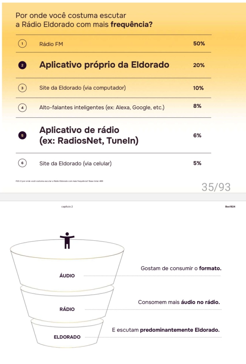 Uma pesquisa qualitativa encomendada pelo Grupo Estado há 11 meses, realizada com 504 pessoas (ouvintes da Rádio Eldorado e leitores do Estadão) pela agência Box1824, concluiu que, em termos de negócio, a Rádio Eldorado tem um LTV (Lifetime Value, ou Valor do Tempo de Vida) muito alto. Primeiro, porque seus ouvintes são extremamente fiéis à rádio. “E a conexão com a marca gera um potencial de cross sell e up sell trabalhando novos formatos e conteúdos”.
